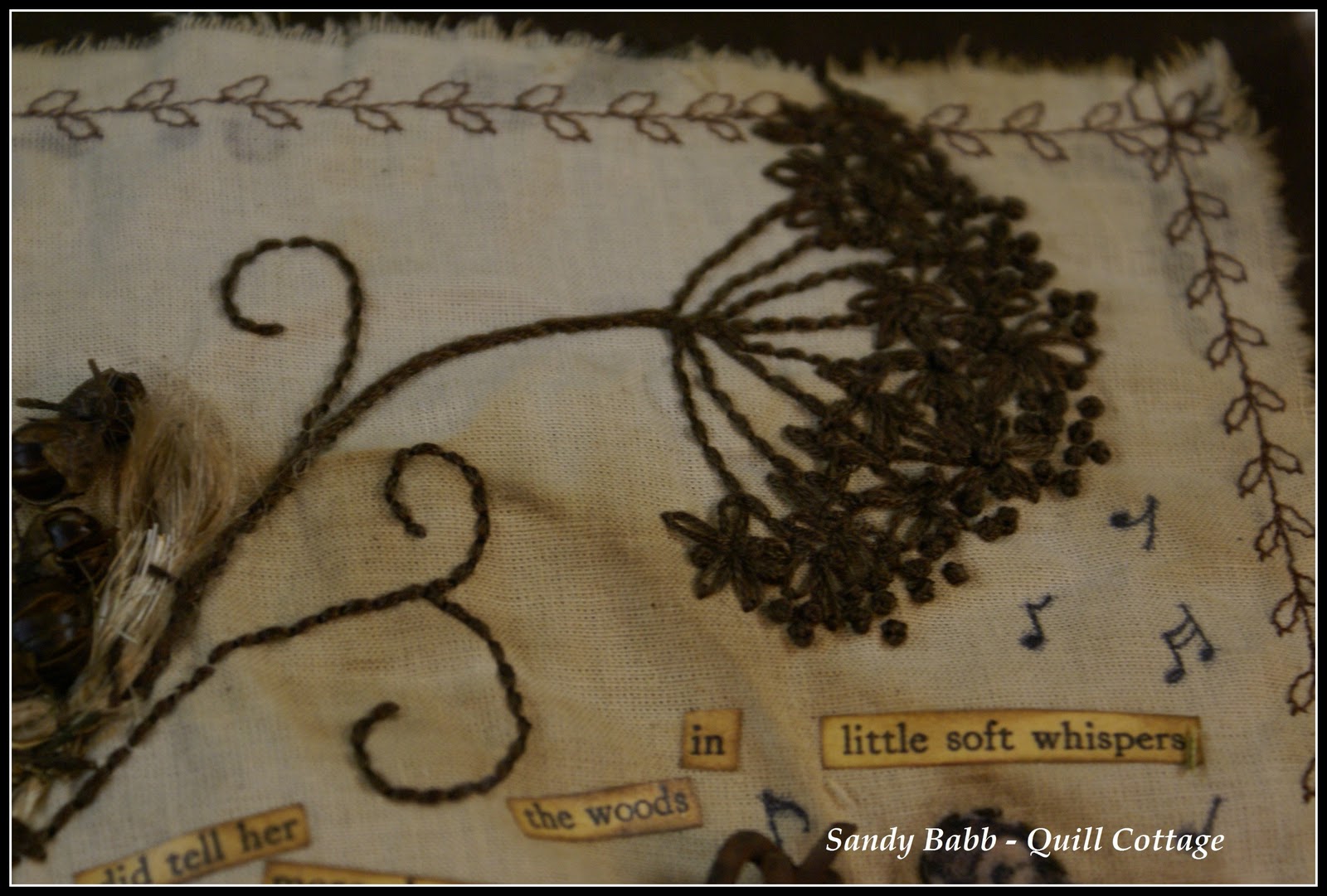 Oh dear Sandy, I love,love,love it- how very beautiful- the sewing around the birds, and the embroidered "flower" together with the big stiches on the nest, rust ,--everything is amazing, and looks gorgeus.Love your flowers, and little text pieces.