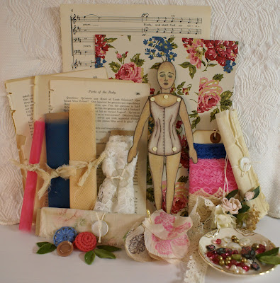 I have been doing a little bit of a studio de-stash and putting together some art and embellishment kits. I have finished and listed four themed kits in my shop, Quill Cottage Curiosity Shoppe. Each kit contains ephemera, fabric, trims, and embellishments perfect for making cards, tags, or collage projects. Each provides a little extra inspiration for jump starting your creativity.